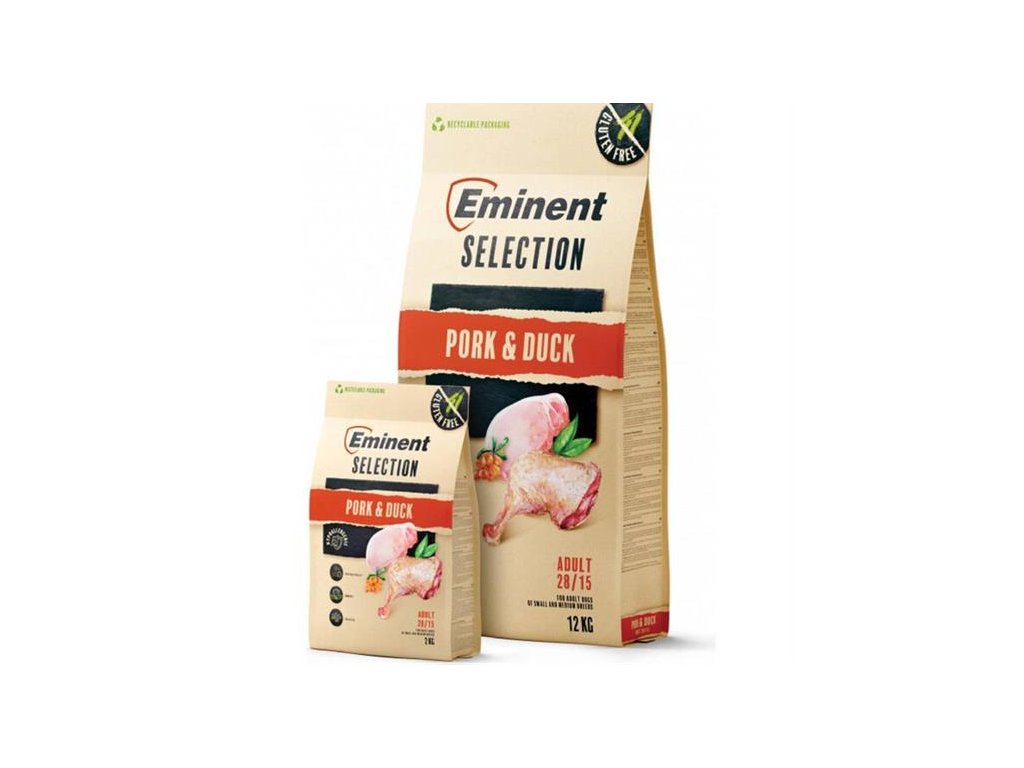 Eminent Dog Selection Adult Pork & Duck je bezlepkové superprémiové krmivo vhodné pre všetky malé a stredne veľké psy.