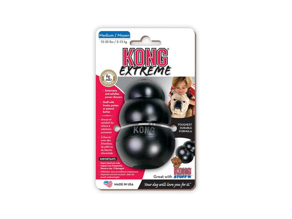 Hračka Extreme Kong je plniteľná hračka pre psov zo špeciálnej odolnej gumy. Je vyrobená z ultra elastického čisto prírodného kaučuku, pomáha čistiť chrup a masíruje ďasná. Špeciálny tvar zaisťuje pri dopade nepravidelný odraz. Hračka sa dá naplniť pamlskami alebo pastou a zvyšuje tak záujem psa o hračku.