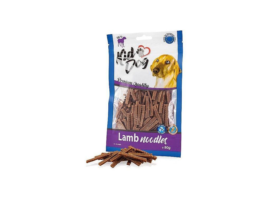 Drobné mäsové rezančeky Kiddog sú vhodné predovšetkým pre malé psy a mačky. Rezance majú jahňaciu príchuť a zvierací maznáčik si ich ihneď zamiluje. Maškrty pre psov Kiddog napomáhajú pri výcviku psa, skvele chutia a božsky voňajú! Pre jednoduchšie podávanie je možné nakrájať na drobnejšie kúsky. Maškrty nenahrádzajú bežnú stravu! Podávajte ich v primeranom množstve a vždy dbajte na to, aby mal pes k dispozícii dostatok čerstvej pitnej vody.