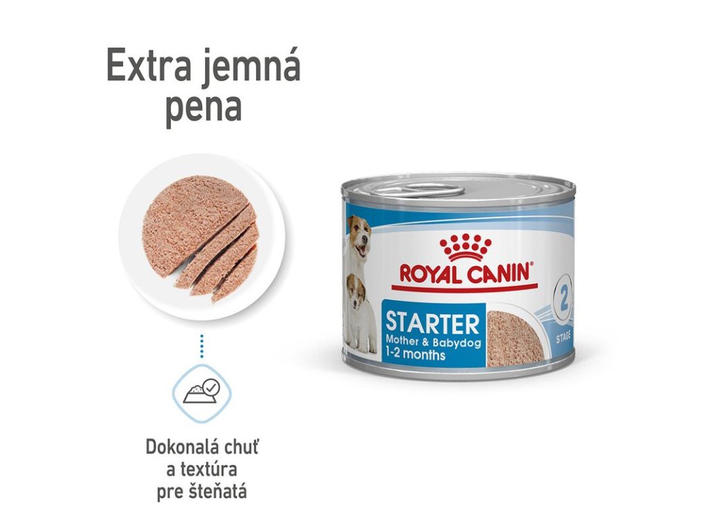 Krmivo Royal Canin Starter Mother & Babydog Ultra Soft Mousse je špeciálne navrhnuté tak, aby spĺňalo nutričné potreby tehotných alebo dojčiacich sučiek a šteniatok do 2 mesiacov.