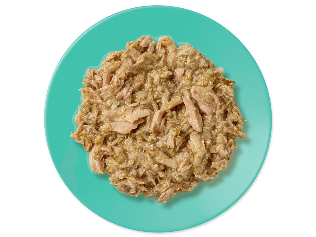 Zloženie: mäso z tuniaka 60%, rybací vývar 28%, morské riasy 5%, ančovičky 5%, ryža 2%.