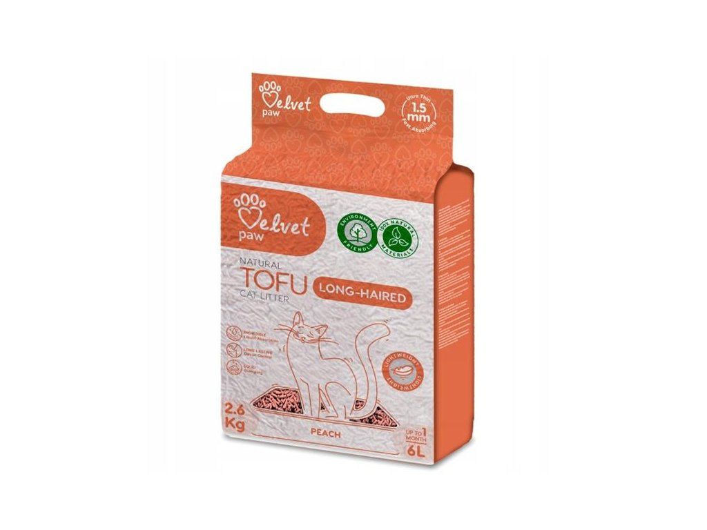 VELVET PAW TOFU s broskyňou je ideálnym riešením pre opatrovateľov dlhosrstých mačiek – maximálna hygiena, jemná vôňa a prírodné zloženie, ktoré sa stará o mačku aj o životné prostredie.