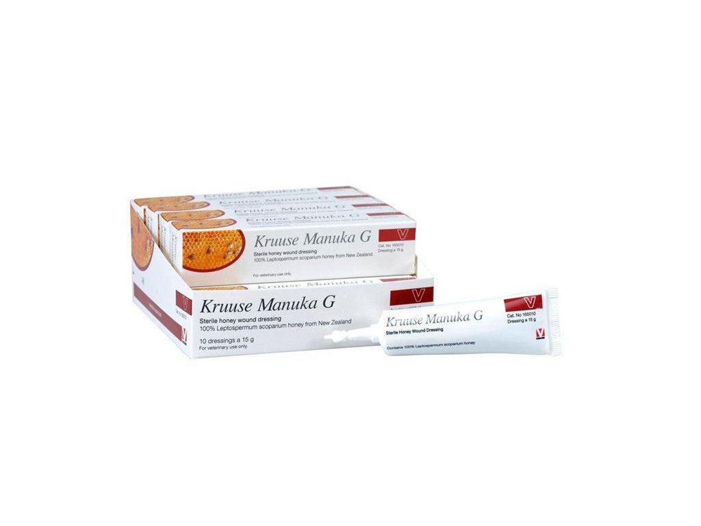 Gel Manuka G sterilný 15 g. Na hojenie rán s obsahom 100% medu z rastliny Leptospermum scoparium /Manuka, Balmín metlavý/, určený aj na kontaminované rany, abcesy. Aplikuje sa priamo na ranu, pomáha udržať vlhké prostredie v rane, čím sa podporí proces hojenia.