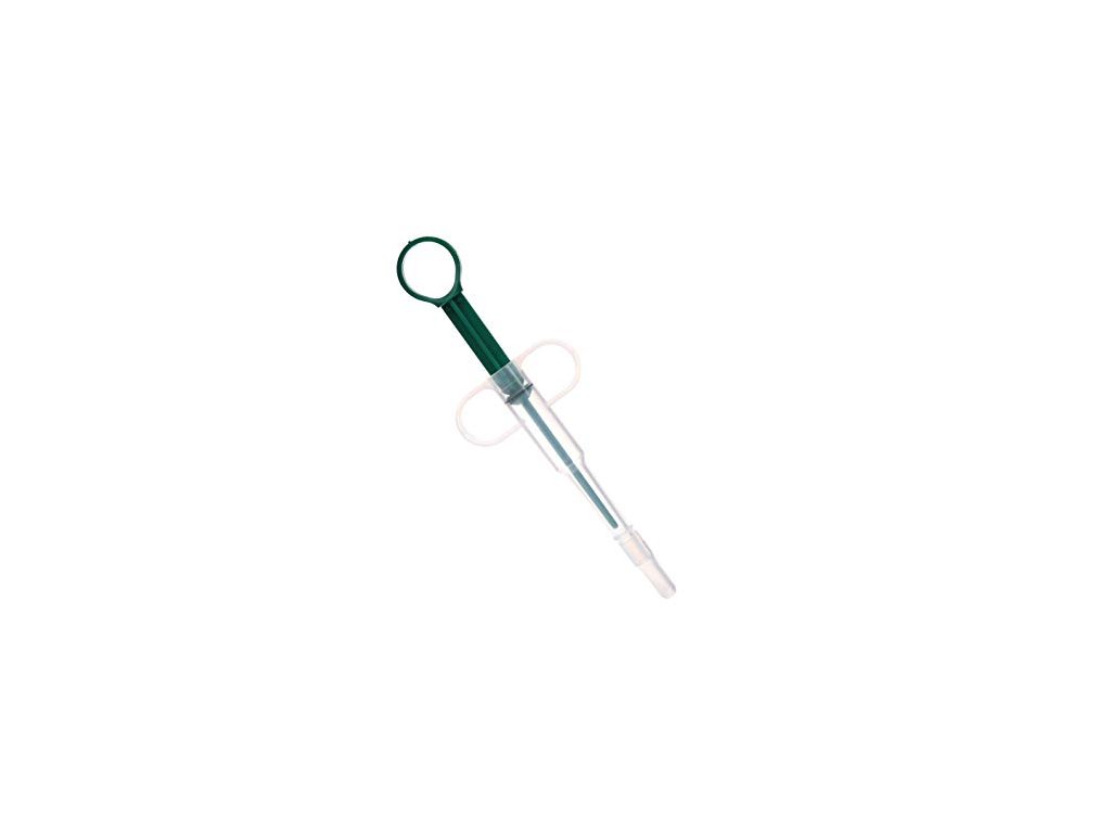 Medzi koncové čeľuste zasuňte podávanú tabletu, uchopte podávač tak, aby ste mali palec pripravený v zelenom držadle piestu. Podávač vsuňte do papule zvieraťa až ku koreňu jazyka. Piestom uvoľnite tabletu a zvieraťu rýchlo zatvorte a mierne zakloňte hlavu, aby bolo nútené prehltnúť.